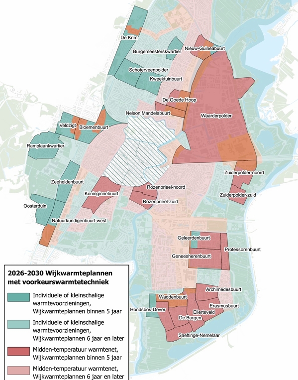 Voor onze wijk, die ligt in het Te Zaanenkwartier, is voorzien dat wij geen warmtenet gaan krijgen. Dit geldt niet voor de nieuwbouw van de Orionzone, deze worden wel aangesloten op een warmtenet. De reden is dat het kostentechnisch voor onze wijk goedkoper is om geen warmtenetaansluiting te krijgen. Wij kunnen verwachten dat wij individuele of kleinschalige oplossingen krijgen. Dit kan een individuele warmtepomp zijn of een kleinschalig warmtenet met een aantal buren. Dit zou bijvoorbeeld met Zonnewarmte of Bodemwarmte kunnen.